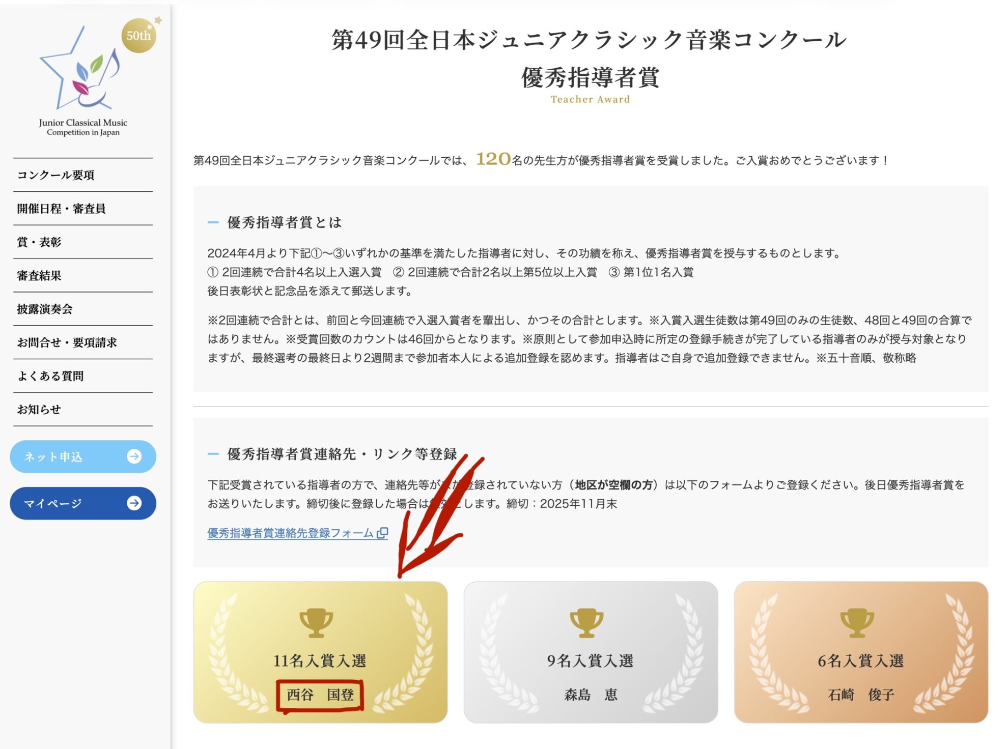 遂に、第49回全日本ジュニアクラシック音楽コンクールにて、全国すべての部門の優秀指導者120名の中から、入賞・入選者数で第1位をいただくことができました!祝✨受賞サイトはこちら!
